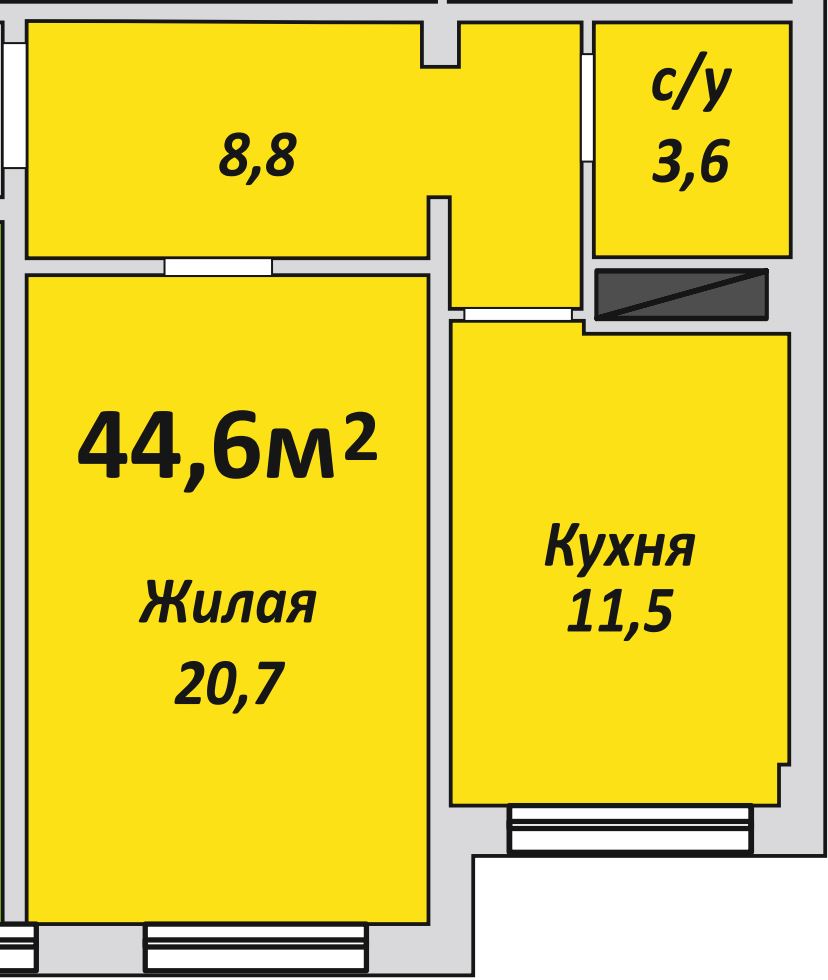 Однокомнатная , №183 , 44.6 м2